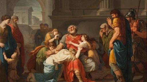 Pintura que retrata a grande tristeza e sofrimento de Édipo(centro) ao perceber teu destino